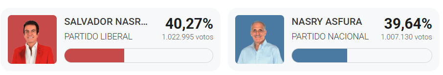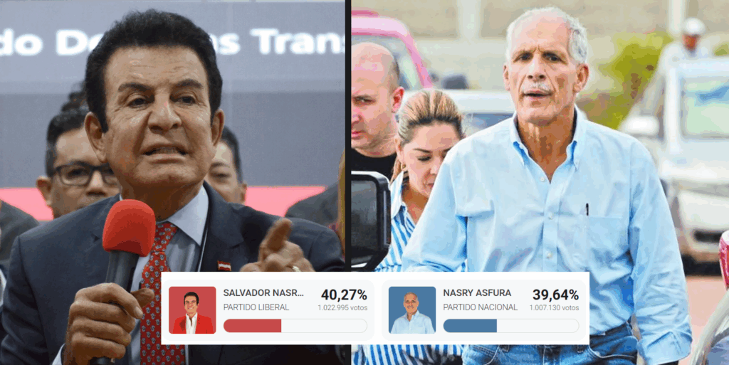 Hasta el último corte del escrutinio preliminar, con el 78% de las actas procesadas, Nasralla suma 1.019.897 votos (40,32%), mientras que Asfura registra 1.001.765 votos (39,6%), una diferencia de apenas 18.000 sufragios, lo que mantiene al país en un virtual empate técnico.