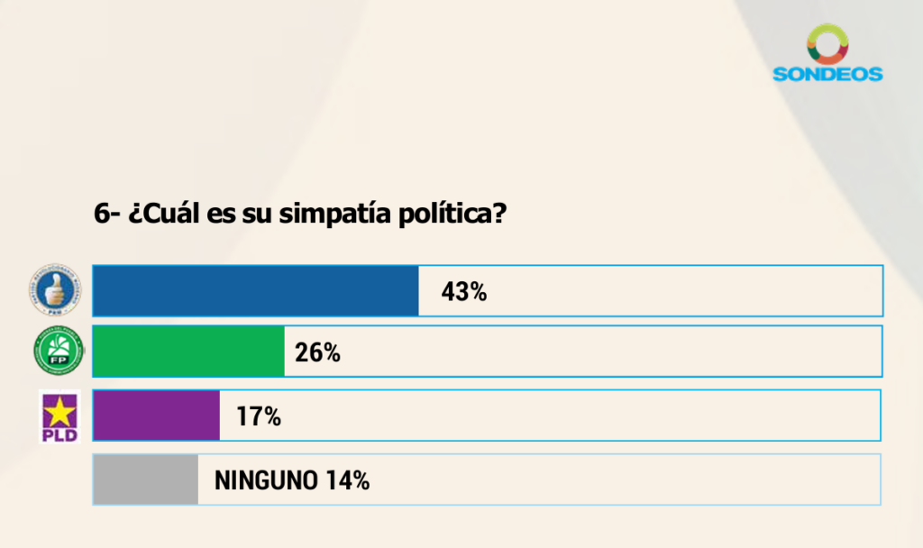 En el ámbito político-electoral, la encuesta posiciona al Partido Revolucionario Moderno (PRM) como la principal fuerza política del país con un 43% de preferencia.