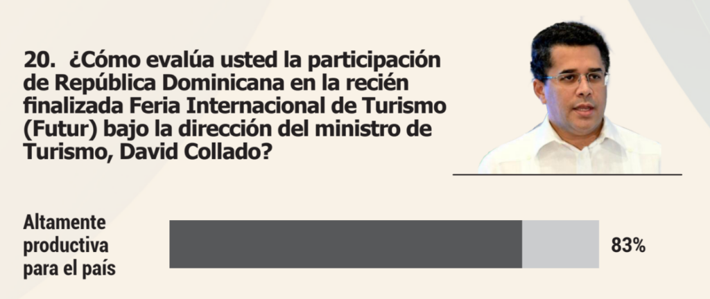 La encuesta también midió la percepción ciudadana sobre el desempeño de los principales funcionarios del Estado. El ministro de Turismo, David Collado, encabeza la lista con un 81 % de valoración alta, seguido por el ministro de Educación, Luis Miguel De Camps, con un 77 %.