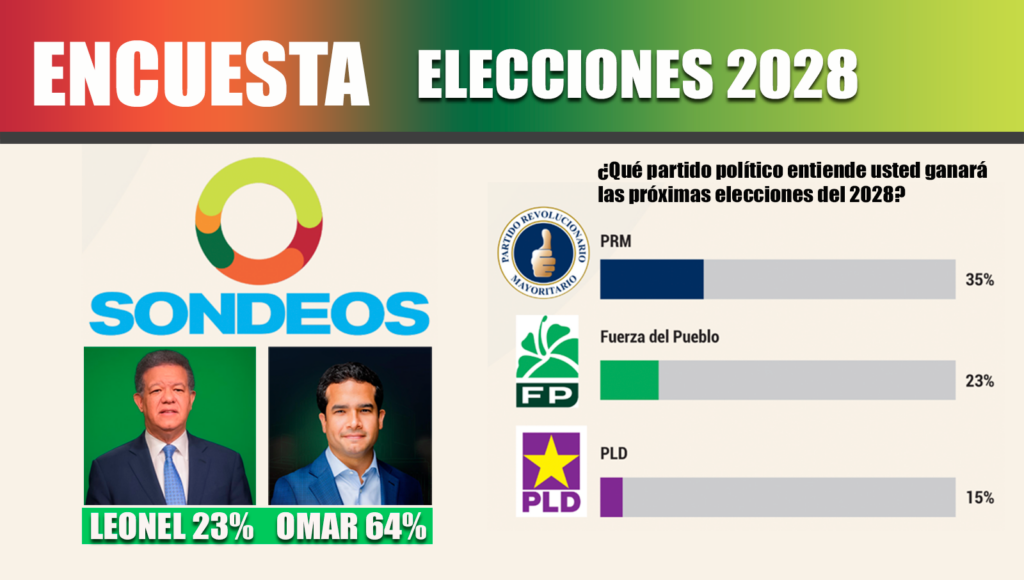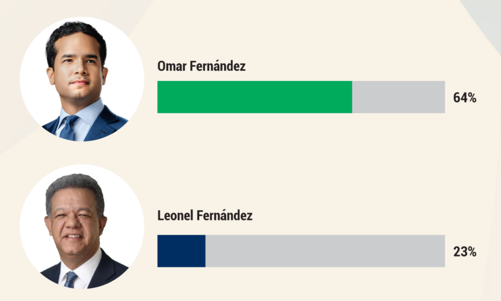 En el ámbito opositor, la encuesta revela que Omar Fernández se consolida como la principal figura presidencial dentro de la Fuerza del Pueblo. Ante la pregunta sobre quién debería ser el candidato presidencial del partido en 2028, el 64 % de los entrevistados respaldó a Omar Fernández, frente a un 23 % que favoreció al expresidente Leonel Fernández. Un 13 % no emitió opinión.